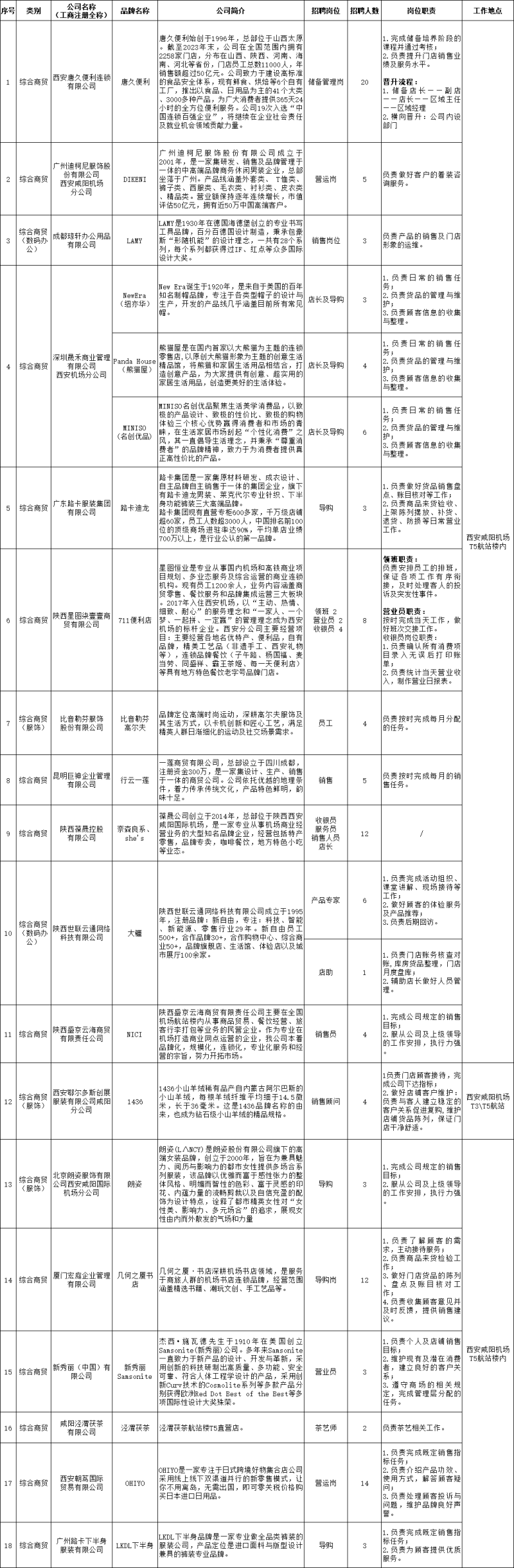 为保障机场三期顺利投运、助力T5航站楼商务区正式启幕,由西咸新区社会事业服务局指导,空港新城将联合咸阳经济技术开发区在西咸新区底张街道举办机场T5航站楼商务区入驻商业(综合商贸类、现代服务类)专场招聘会。届时,LAMY、711便利店、大疆、新秀丽、陕拾叁、同盛祥等知名企业将面向社会提供储备管理岗、营运店长、产品专家、销售顾问等400余个优质岗位,诚邀各界英才,期待您的加入。