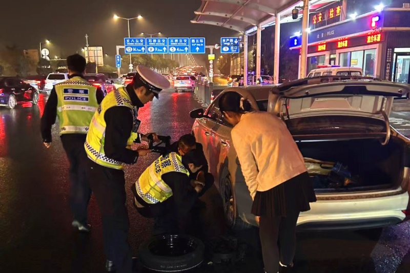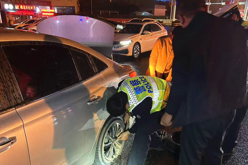 “没事,有我们在。”简单的一句话,让车主瞬间安下心来。执勤警员二话不说,从警车上取出千斤顶、扳手等工具,蹲在路边开始换胎。彼时夜色已深,气温偏低,他们的手指很快冻得通红,但手上的动作丝毫没有停歇,支千斤顶、卸螺丝、装备胎,一系列操作有条不紊。操作的同时,还耐心向车主讲解换胎技巧和注意事项:“螺丝要对角拧,备胎不能开太快,后续要赶紧去修理厂更换正规轮胎。”