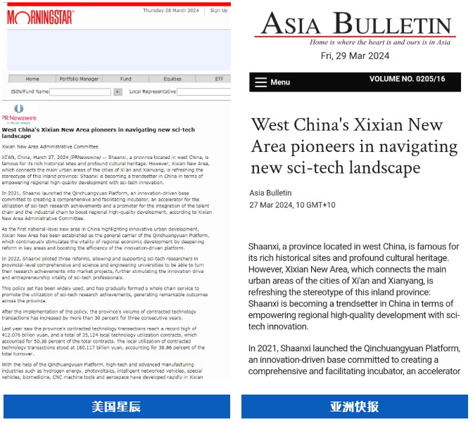 全球通讯社联盟发布文章《West China's Xixian New Area pioneers in navigating new sci-tech landscape》(中国国家级新区西咸新区竞逐科技创新“新蓝海”),被全球510家外媒转载,截至目前,总浏览量超3亿人次。