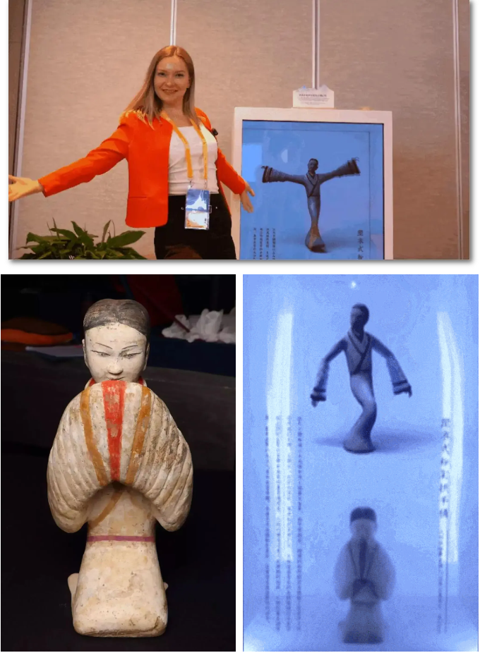 汉景帝阳陵出土的汉塑衣式彩绘拱手跽坐女俑,也拥有自己的数字形象。技术人员使用数字采集方式制作数字档案,采用3D建模技术还原文物样貌,借助动作捕捉、渲染等技术,让观众得以欣赏到2000多年前的汉代仕女风姿,感受“文化+科技”带来的全新体验。