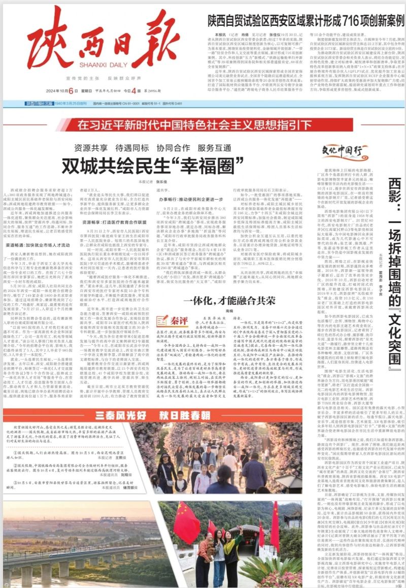 10月6日,陕西日报头版头条刊发《双城共绘民生“幸福圈”》,报道西咸两地加速推进公共服务一体化进程,民生“幸福圈”正越来越大,全文如下。