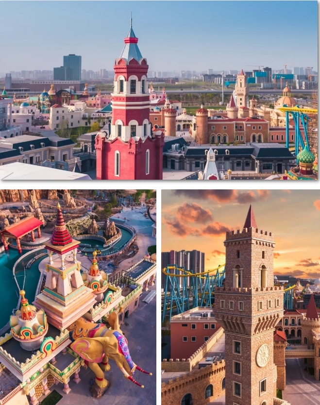 丝路欢乐世界将共建“一带一路”国家地区的风土人情汇聚一城,设置七大丝路文化主题街区,每个街区都是独一无二的风景。“神奇中华”挺立着的两座汉代阙楼,彰显着长安的恢宏气势与开放气度;“恒河象谷”里,绚丽的色彩和风情,呈现古印度文明的印记;在“沙海秘境”,撒马尔罕的驼铃悠然响起,中亚与西亚的音律尽在耳畔;彩色玻璃、马赛克装点下的斑斓,将“瑰丽波斯”的璀璨艺术华丽重现;“梦幻雪国”壮观华丽的北欧城堡、“阳光希腊”的蓝色屋顶,还有“荣耀罗马”融合了古罗马和意大利文艺复兴时期风格的建筑景观。