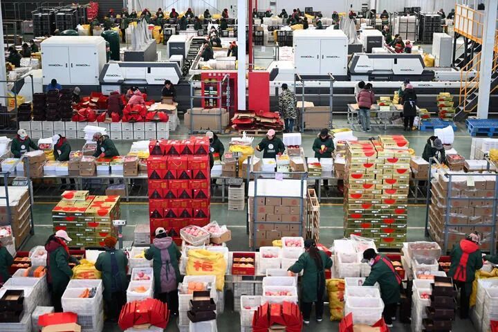 | 2025年1月6日,在延安市洛川县一家果业企业,工作人员在生产线工作。新华社记者 张博文 摄 |