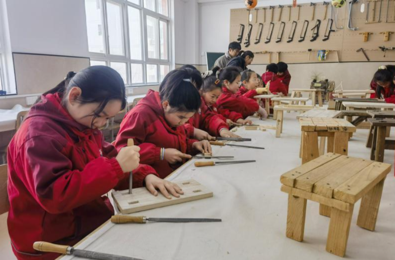| 沣水园小学木艺教室里,孩子们制作小板凳 |