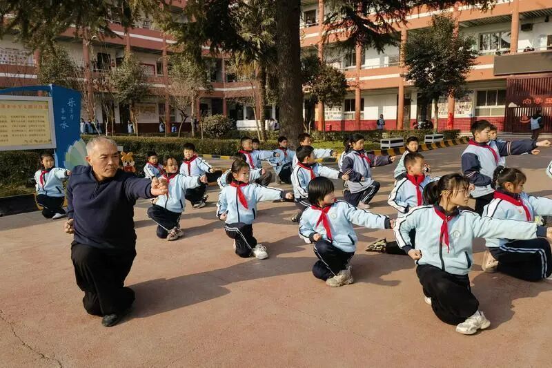 为贴合不同年龄段孩子的身心特点,范风鹏制定了分阶教学方案:低年级学生从抱拳礼学起,先掌握弓步、马步、仆步、歇步、虚步五种基本步法,以及拳、掌、勾手三种基本拳法;三年级及以上学生则传授一路长拳、红拳十三式、棍法等进阶内容,在锤炼体魄的同时,磨砺意志品质。