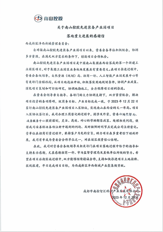 01成都市南控智慧科技产业发展有限公司发来感谢信
