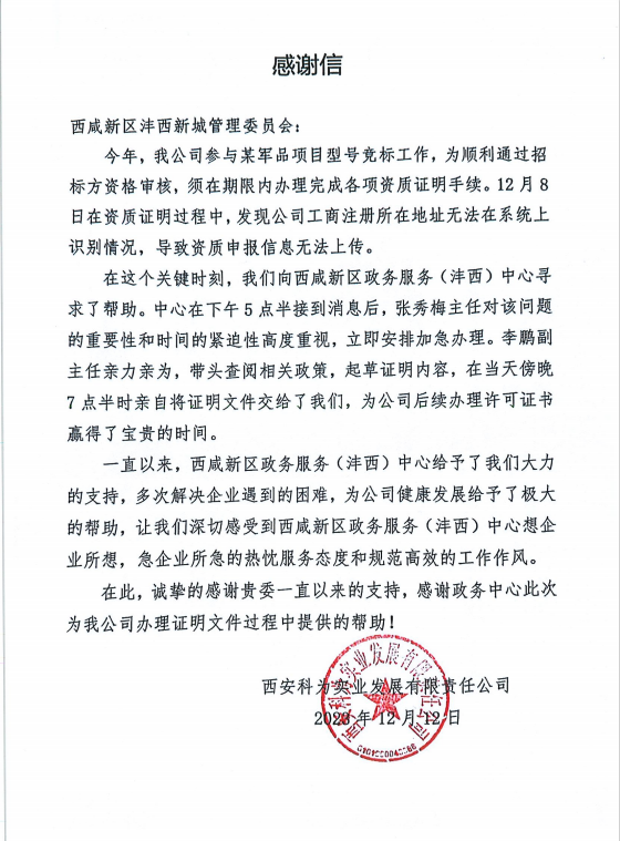 信中表示:我司参与某军品项目型号竞标工作,在资质证明过程中,发现公司所在地址无法在系统上识别情况,导致资质申报信息无法上传。在西咸新区政务服务(沣西)中心的帮助下,当天将证明文件交给了我们,为我司后续办理许可证书赢得了宝贵的时间,给予了我们大力的支持,多次解决企业遇到的困难,为公司健康发展给予了极大的帮助。