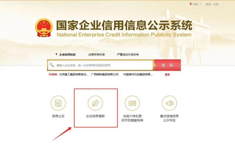 第一步:用微信“扫一扫”扫描营业执照右上角二维码或在浏览器输入网址http:/www.gsxt.gov.cn进入国家企业信用信息公示系统,点击“企业信息填报”。