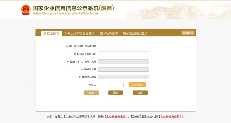 第四步:点击“联络员登录”,输入营业执照信息与经营者信息后点击“登录”进行年度报告填写。