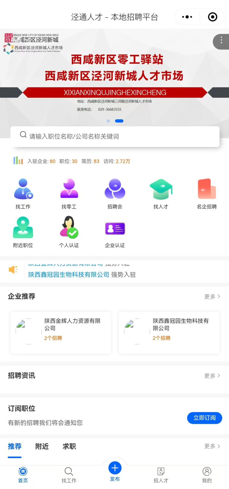 今年以来,泾河新城紧紧围绕辖区内企业用工需求和就业者求职需求,搭建西咸一体化人才市场(泾河新城分站),设立园区就业服务站、红色就业信息亭,研发“泾通人才”线上招聘用工平台,持续丰富就业服务“工具箱”,累计举办综合类、零工类、服务业专场、联合招聘会等招聘活动14场,走访秦氢元、西部超导、黄冈学校等80余家企业,收集各类用工需求4000余个,已实现就业2000余人。