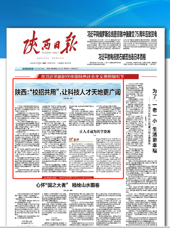 近日,陕西日报头版头条刊发《陕西:“校招共用”让科技人才天地更广阔》,报道了西咸新区沣西新城“校招共用”引才用才模式,深化高校、企业和地方之间的科技创新协同,助推创新链产业链资金链人才链深度融合。