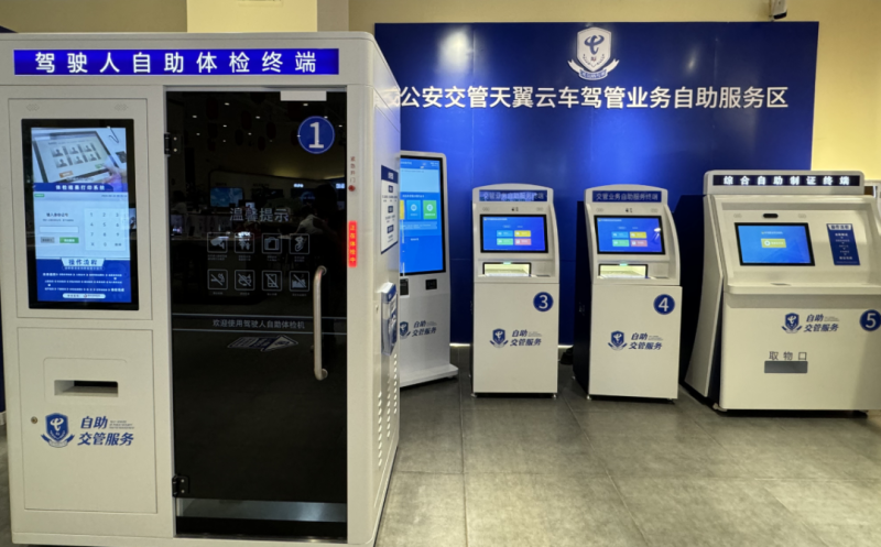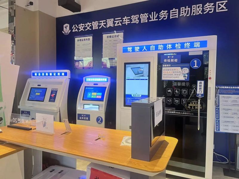 在沣西新城西部云谷二期,新区首个公安交管天翼云车驾管业务自助服务大厅也于近日投入使用。大厅内配备了自助体检机、交管业务自助服务机和综合自助制证机,驾驶人可通过这些自助终端自行办理驾驶证及机动车相关业务。