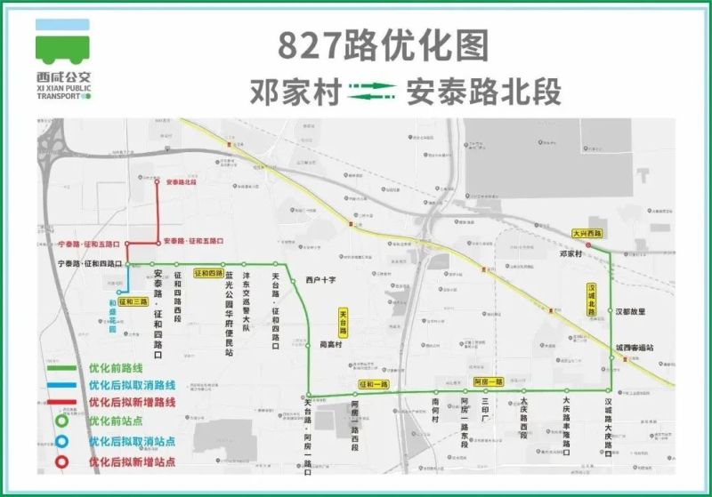 调整后:线路由“安泰路北段”始发,沿安泰路、征和五路、宁泰路、征和四路、天台路、阿房一路、大庆路、汉城北路、大兴西路行驶至“邓家村”