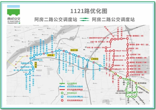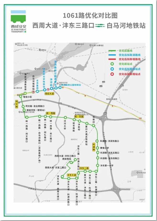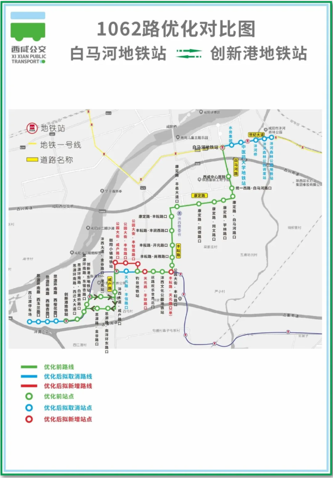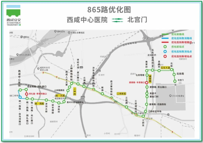 现对原线路的统一路至白马河路段进行调整,并将终点站调整至“西咸中心医院”。