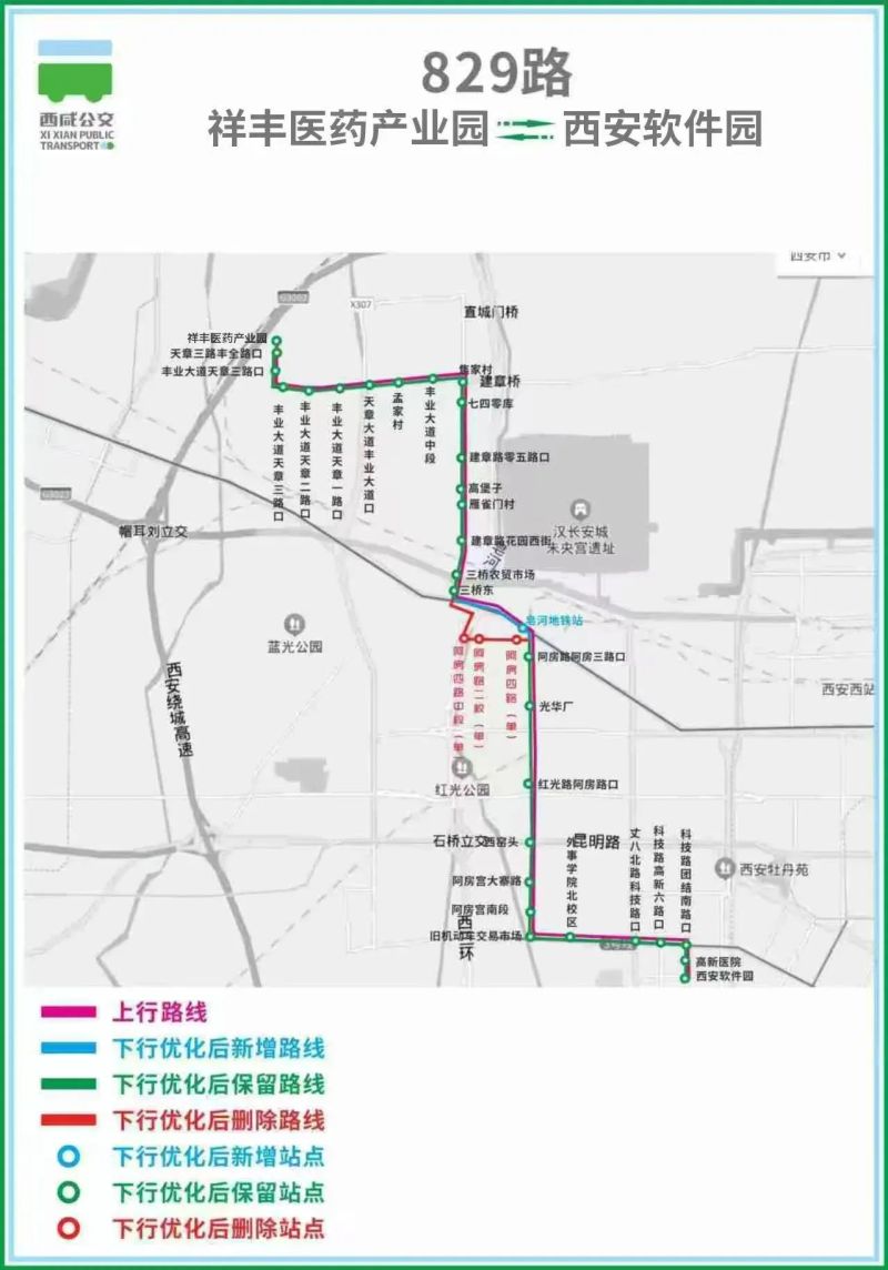 829路线路下行“西安软件园-祥丰医药产业园”的走向进行调整。