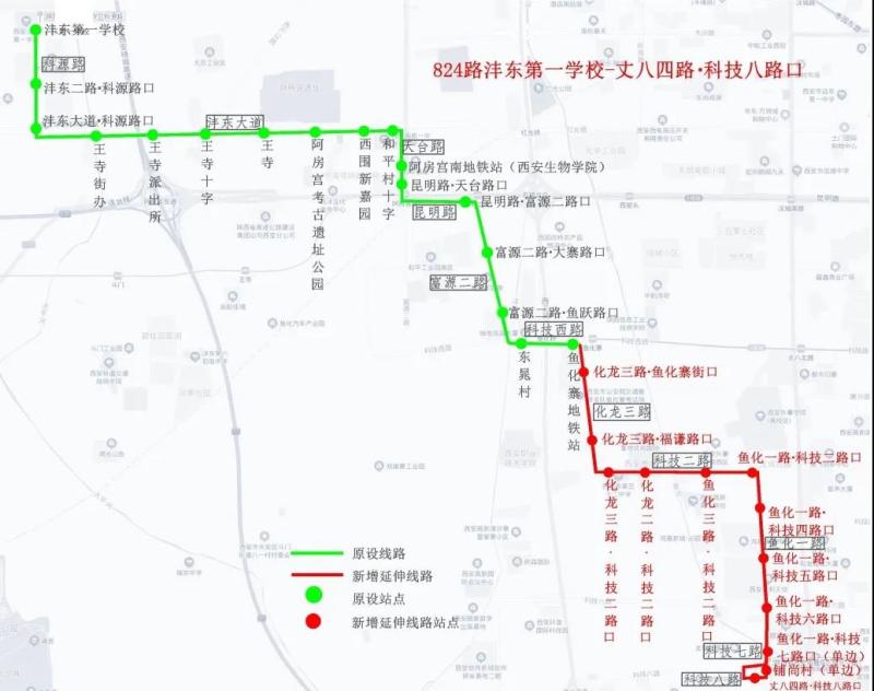 今天(4月17日)起西咸公交824线路增加12个站点,优化延伸至丈八四路·科技八路口。同时为满足辖区学生通勤需求助学专线也增至2条。