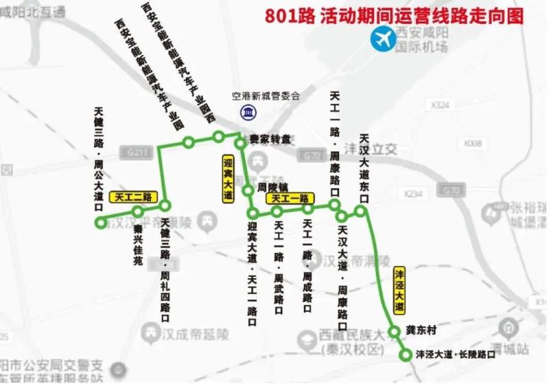线路走向:801路原线路由天健三路·周公大道口至上林路地铁站,活动期间该线路仅运营天健三路·周公大道口至沣泾大道·长陵路口段。