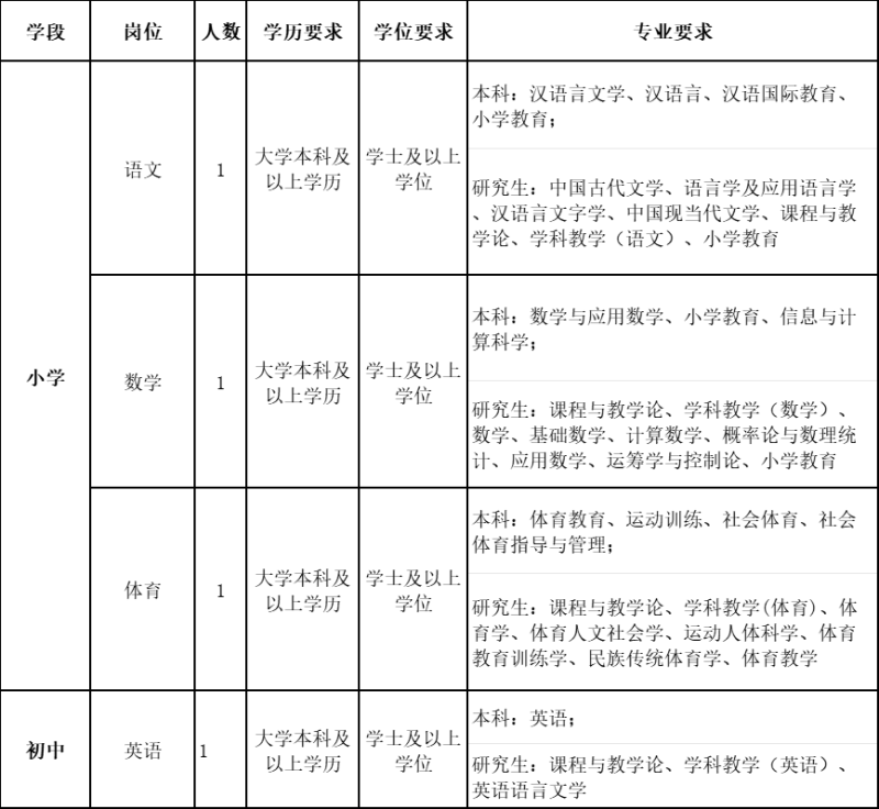 小学教师计划招聘3名。其中:小学语文2人,小学数学1人。