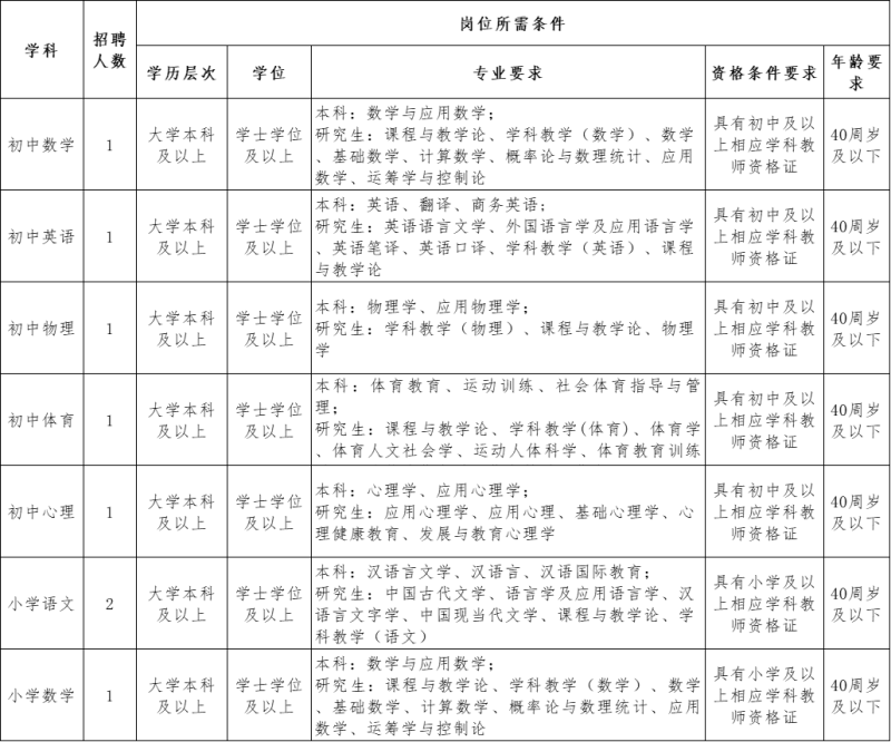 报考教师岗位的,满足以下条件之一者,学历可放宽至大专,专业不限,教师资格证学科不作要求,年龄放宽至45周岁(1979年7月14日以后出生)。