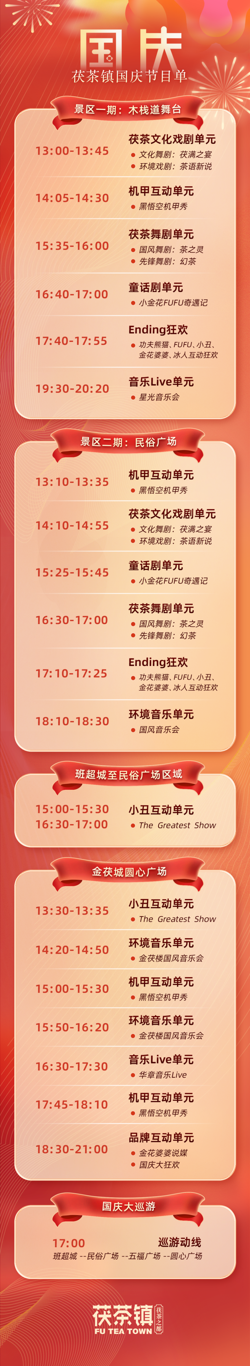 茯茶镇国庆活动丰富多彩,茯茶为主题的舞剧《茯满之宴》《茶之灵》《幻茶》带您走进茶的奇幻世界。茯茶镇IP出动,一起乐游国庆假期!《茶与新说》《FUFU奇遇记》围观金花婆婆、茯冰人,和“小金花FUFU”一起“耍宝”,看古朴小镇的另一面。