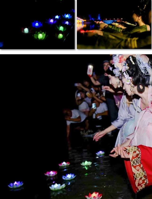 等到夜幕降临,灵波剧场东侧下水步道的放河灯祈福(8月29日19:10-19:30)更绝,跟着NPC把河灯放进湖里,点点灯光顺着水流飘远,像把星星撒进了湖面,浪漫到想原地求婚。