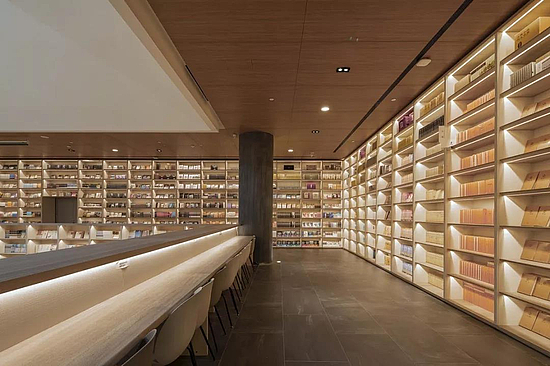 人文社科区接续中庭的中轴对称布局,以木质、石材和金属描绘直线构图的陈列细节。材质的自然肌理附着在桌椅家具的简约形态中,营造出柔和温润的氛围体验。基于复合经营的商业考量,图书业态与其他消费业态有机结合。低调置入的咖啡区提供了更休闲式的社交空间,墨绿点缀穿插在木色空间中,也成为跳动的个性隐喻。