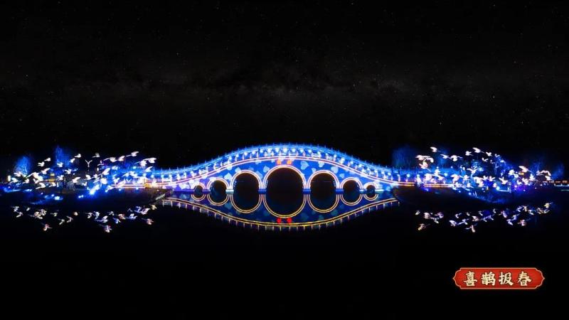 浪漫的鹊桥也披上了华彩锦衣,姿态各异的喜鹊花灯在桥的两端亮起,定格了鹊桥相会的惊喜瞬间。