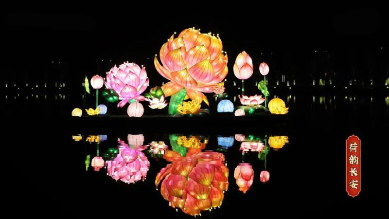 “荷韵长安”是一组莲花灯,在水中倒影的映衬下,令人心旷神怡。