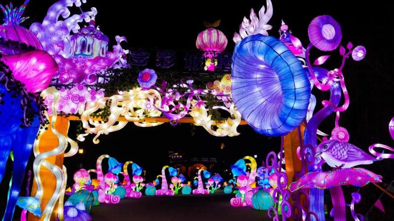 在这片花灯“森林”里,蘑菇屋、各类奇花异草、飞禽走兽等应有尽有。