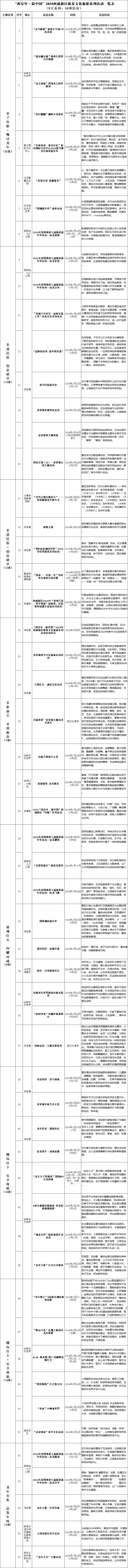1月18日至3月上旬,2024年西咸新区新春文化旅游系列活动横跨除夕、元宵等多个年俗节日,共计52天,包括“亲子乐游 嗨过龙年”“非遗民俗 创意研学”“多彩演艺 喜迎新春”“璀璨灯火 闪耀西咸”“潮玩打卡 乐享体验”“龙年吉市 品鉴年味”等6大主题56项活动,具体如下: