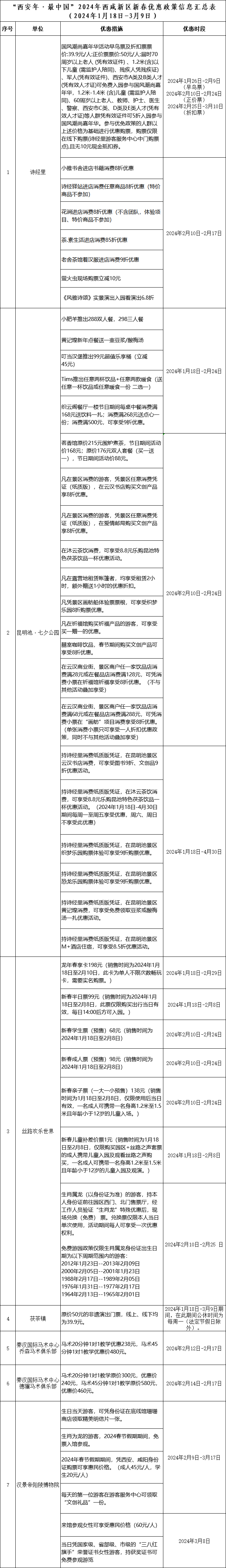 此外,辖区的7家景区还推出了45项优惠政策,汉景帝阳陵博物院除夕至初八,丝路欢乐世界2月10日至25日期间对生肖为龙的游客可以免票游玩、昆明池、诗经里推出进店消费减免……游客在春节假期吃住逛玩完全不用愁。