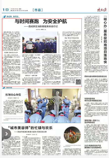 4月26日,《陕西日报》专栏大篇幅报道了题为“与时间赛跑 为安全护航——西咸新区消防智能系统运行记”的报道,就西咸新区消防救援支队依托物联网、大数据、云平台、5G、人工智能等前沿技术建成使用的智能接处警和智能指挥系统,队伍信息化建设的经验成果进行了介绍。与此同时,新浪网、搜狐网等各大门户网站也对支队该项工作进行了专题报道。
