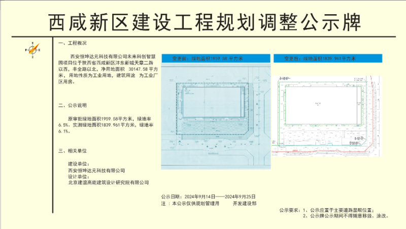 根据西安市自然资源和规划局《关于加强建设工程规划条件核实管理工作的通知》,现将未来科创智慧园项目规划许可内容调整予以公示。批前公示并非最终审批结果,在公示期内,利害关系人若有意见,可来电向西咸新区沣东新城开发建设部反映。
